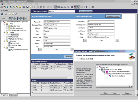 Assemble. Don't Code. Creating composite applications has never been easier. Simple drag and drop visual tools and wizards let you quickly assemble composite applications with no coding. Studio enables IT personnel to leverage their application functionality while insulating them from unnecessary technical details by providing easy to understand and use interfaces rather than low-level programming-oriented interfaces. The assembly environment in Above All Studio lets you quickly reuse and re-purpose proven functionality. Now, you can assemble new composite applications that utilize the application functionality and best practices you have already defined, implemented and proven. By assembling applications, instead of coding them, integration projects that were previously unjustifiable with traditional middleware approaches now become cost effective.