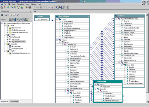 eliminating code generation. Bridge the Gap. Studio's visual modeling capabilities allow you to create new, more useful business services from the low-level services typically found in enterprise IT environments. These refined services make it faster and easier to repurpose existing application functionality as new composite applications. With Above All Studio you can create simplified interfaces, coarser-grained abstractions or combine related services into new services. While Web services standards are great for providing a common syntax, they don’t help resolve how disparate services interoperate semantically. This is where Above All steps in. How a 'customer' business object is defined in one application doesn't usually map to how it is defined in a different system. In addition, mapping the relationship between different objects - like customers to their orders - requires a unique understanding of the meaning of each and then a way to standardize the definitions so they can interoperate effectively. Above All Studio's visual tools make it easy for users to capture implicit relationships, and to assist in defining new ones. Studio can actually show you how specific services work with other services.